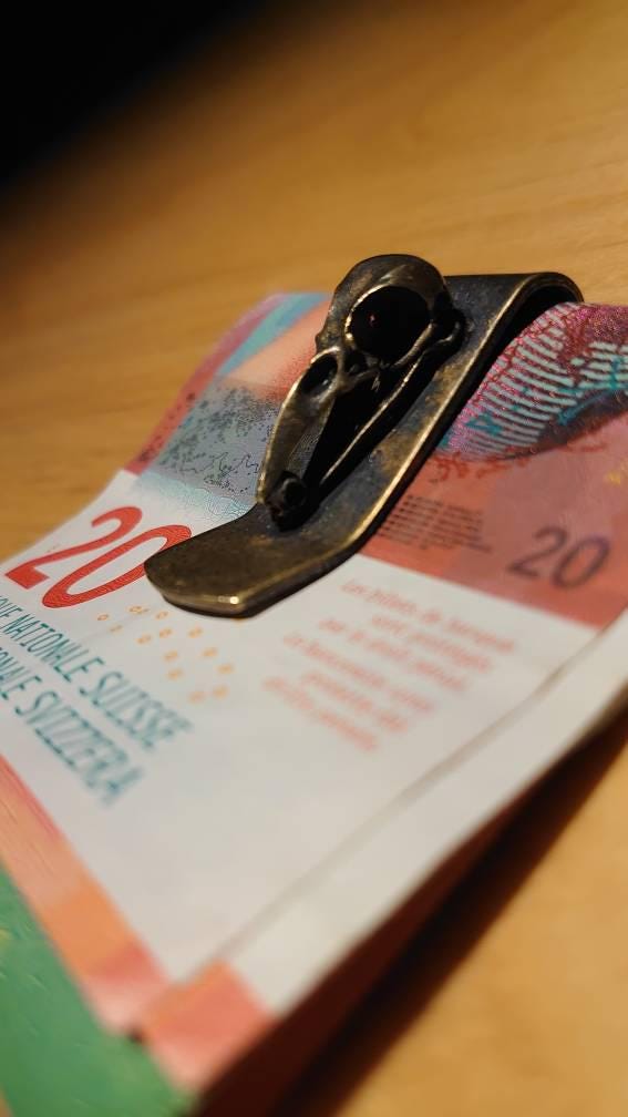 Something that will last forever. This distressed solid brass money clip is a masterclass in dark luxury, featuring a miniature crow skull sculpture on the front that appears to be emerging from the metal itself. The brass has been carefully distressed to give it a worn, vintage look, as if it has been carrying its weight of wealth for decades. The crow skull, expertly crafted in intricate detail, adds a touch of macabre whimsy to the design, making this money clip a true conversation starter. Crafted to last a lifetime, it's a symbol of your appreciation for the finer things in life, and the power of the unknown. A perfect gift for yourself or somebody special.