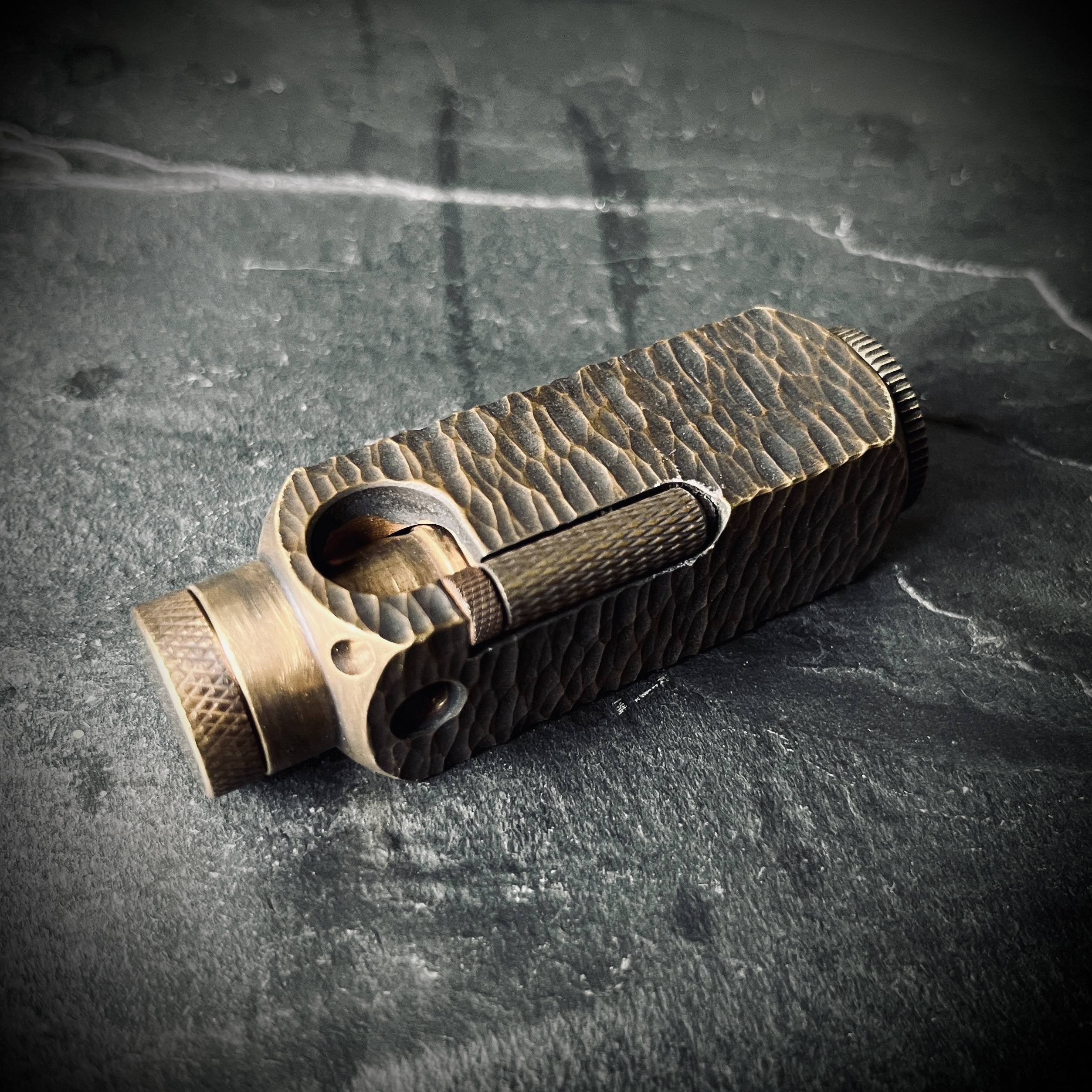 This distressed vintage-style brass trench lighter exudes a sense of bygone elegance, with its richly oxidized surface boasting a beautiful patina that tells the tale of years gone by. The hammered textured surface adds a tactile element to the piece, inviting the touch as the eye is drawn to its intricate details. As the light catches the oxidized patina, it reveals a depth and dimension that is simply captivating, making this piece a true standout in any collection. Its distressed finish only adds to its unique charm, imbuing it with a sense of history and character that is simply irresistible.