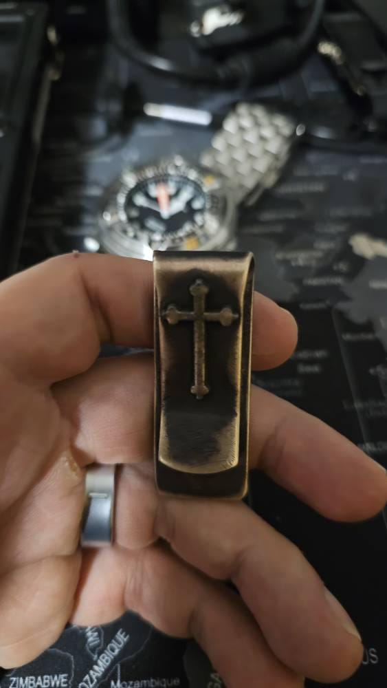 Something that will last forever. High quality personalised solid brass money clip with unique distressing and custom oxidised cross crucifix emblem on the front. This is a solid piece made from high quality solid brass material and will last a lifetime, a perfect gift for yourself or somebody special. Add this to your everyday carry collection and check out the other items available within the online store.